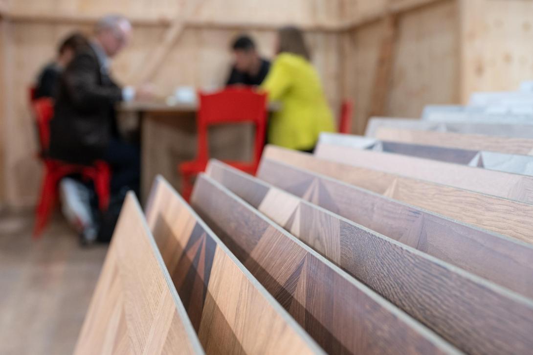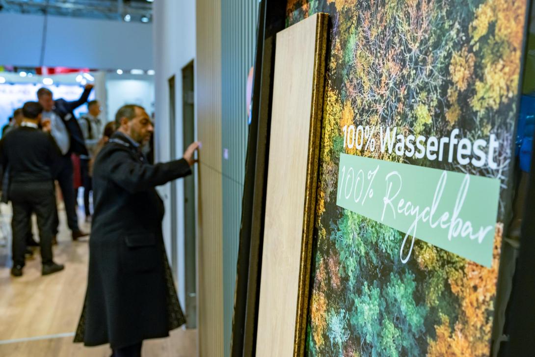 Op de beursvloer lag de nadruk zichtbaar op het totaal van de ruimte, niet alleen op het product op de grond. Naast parket, hout‑ en laminaatvloeren, elastische en designvloeren, tapijt en outdoor‑oplossingen werden ook wand‑ en plafondsystemen, kleuren, tapeten en zonwering gepresenteerd. Voor vakmensen in verf en pleisterwerk was vooral interessant dat vloer, wand en plafond in vele presentaties als één doorlopend concept werden vormgegeven. Combinaties van warme hout‑ of steendecors met rustig gehouden wandkleuren, fijne of grovere structuren en akoestische panelen lieten zien hoe esthetiek, onderhoud en comfort steeds meer als een pakket worden verkocht.