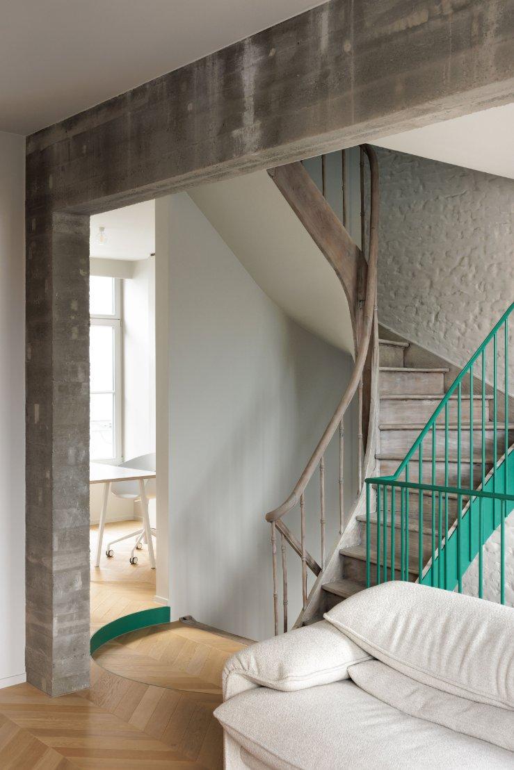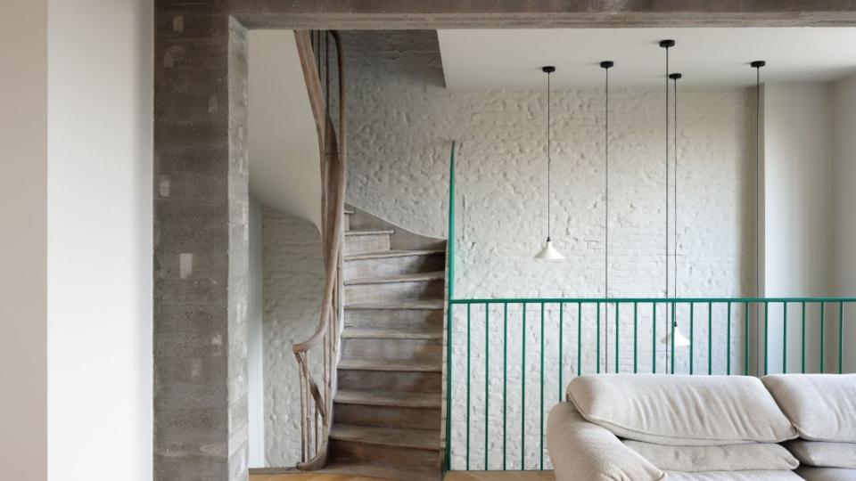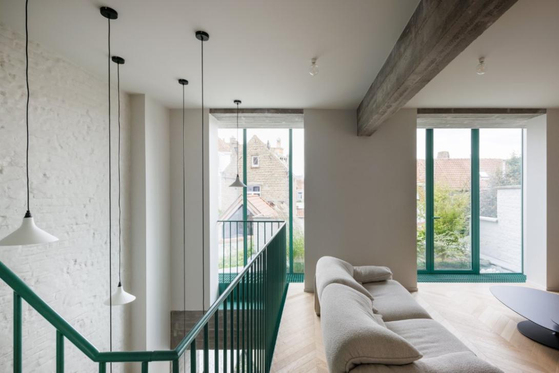 Het kleurenpalet werd bewust sober en harmonieus gehouden. “In onze ontwerpen kiezen we vaak voor één accentkleur, less is more”, vertelt Deceuninck. “Het gaat hier om een gesloten woning met kleine tuin. Om die zo maximaal mogelijk open te trekken, kozen we voor groen in het schrijnwerk en het keukeneiland. De wanden en plafonds zijn uitgewerkt in Chimney Smoke, een lichte grijstint die warmte en gezelligheid brengt. Een witte tint zou hier te steriel zijn. Op de bovenverdieping werkten we met RAL 7032, opnieuw een groentint afgestemd op de gietvloer.”