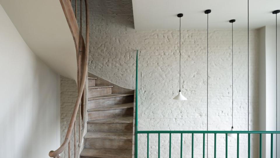 Bij een grondige renovatie is vlieswerk volgens BASIL architecture onmisbaar. Lorenzo: “Na een renovatie gaan de muren zich vaak zetten. Om barsten te voorkomen en zeker te zijn van een mooie gladde afwerking vliezen we alle gyproc of pleisterwerk.” Daarnaast koos het architectenbureau voor een opvallend accent: Calime, normaal gezien een buitenproduct, werd binnen toegepast. “Op de benedenverdieping is er een grote wand die zich uitstrekt van de eetkamer tot de eerste verdieping. Die wouden we met een korrelstructuur uitwerken, als accentmuur. Calime geeft dat effect en behoudt de ‘littekens’ van de muren. Dat geeft karakter. Schilder Christophe van Martlédeco heeft deze techniek met advies van BOSS paints perfect geplaatst.”