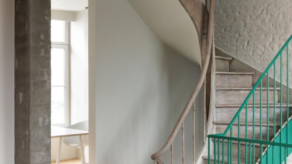 Ondanks die hindernissen koos het team resoluut voor een hoogstaande afwerking met producten van BOSS paints. De wanden werden geschilderd met Boss-hybride in Chimney Smoke (CM 111), raamwerk en deuren werden in dezelfde tint strak afgewerkt met Hybride PU Mat. Ook de plafonds kregen dezelfde tint in Boss-plafond Mat. Voor de tweede en derde verdieping viel de keuze op Boss-hybride in RAL 7032. De keuze voor deze producten was snel gemaakt: “We kozen voor Boss-hybride omdat het bestaande schrijnwerk en de muren in eenzelfde verf doorgeschilderd moesten kunnen worden zonder glansgraadverschil”, verduidelijkt Deceuninck. “Om op de plafonds ook een echt mat effect te kunnen bekomen, kozen we voor Boss-plafond Mat.”